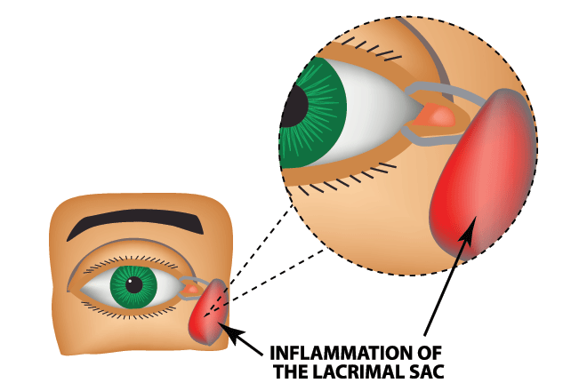 Dacryocystitis is an inflammation of the tear (or nasolacrimal) sac located in the inner corner of your eye. It is often due to blockage of the tear duct that leads tears from the tear sac into the nasal cavity. An infection can cause pain, swelling, watery eyes and discharge.