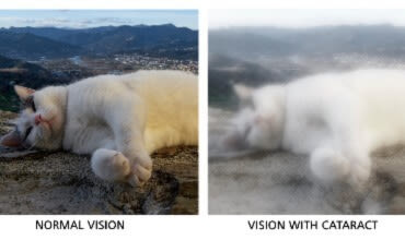 Side by side comparison of normal vision v. vision with cataract