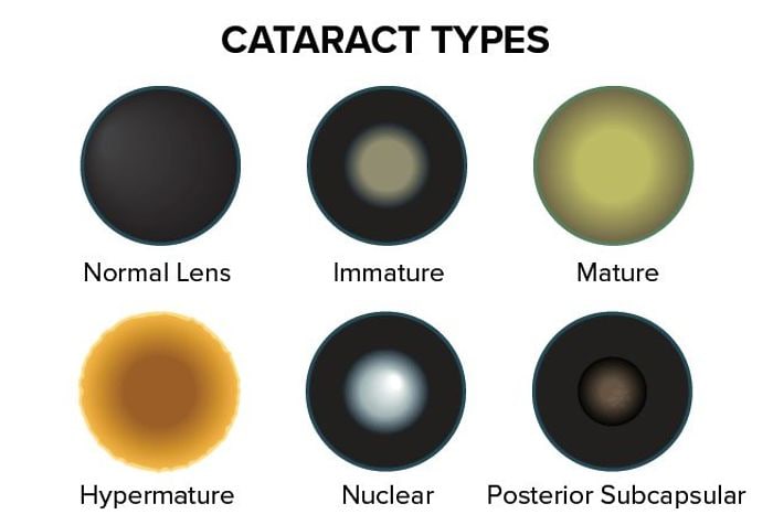 The three most common types of cataracts are nuclear, cortical and posterior subcapsular cataracts. Each one affects a different part of your eye's lens. They're usually caused by natural changes inside your lens as you get older.