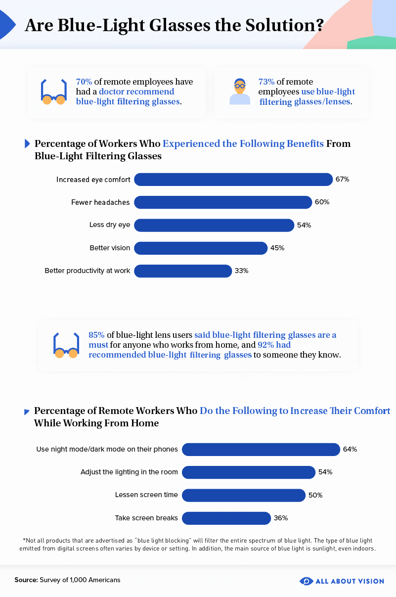 A majority of remote workers (73%) used some form of blue-light filtering glasses/lenses, and of this group, 67% reported increased comfort. Additionally, 85% of wearers said blue-light glasses are a must for anyone who works from home, and 92% had recommended these glasses to someone they know.