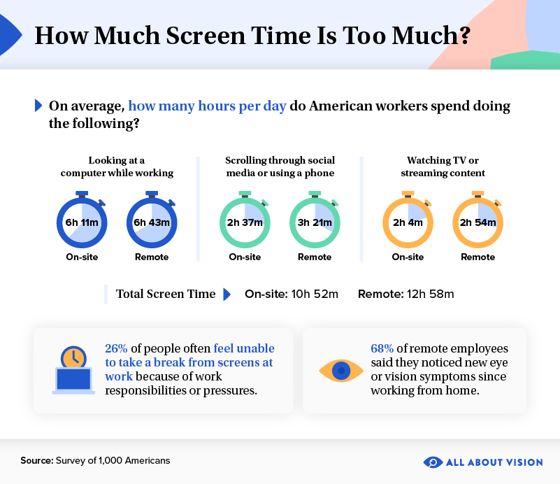 All About Vision surveyed 1,000 Americans about their screen time: 33.53% worked a hybrid schedule; 33.23% worked on-site, and 33.23% worked remotely. Of those we questioned, 71% were parents, while 29% were not. The margin of error was 3%, with a 95% confidence level. For short, open-ended questions, outliers were removed. Survey data has certain limitations related to self-reporting. These limitations include telescoping, exaggeration and selective memory.