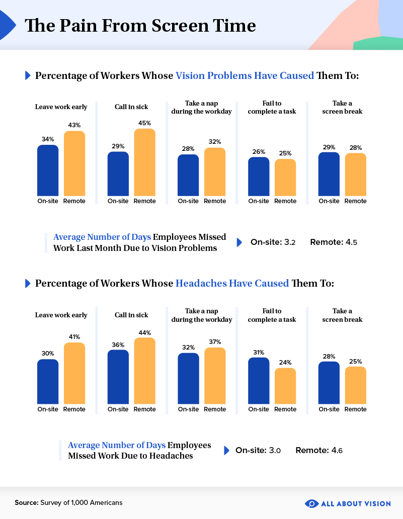 Trends also suggest remote workers take more time off or leave work earlier due to eye strain or headaches. Because of increased productivity, 68% of remote workers said they noticed new eye or vision symptoms since working from home, and 26% of all employees felt unable to take breaks due to work responsibilities or pressures.