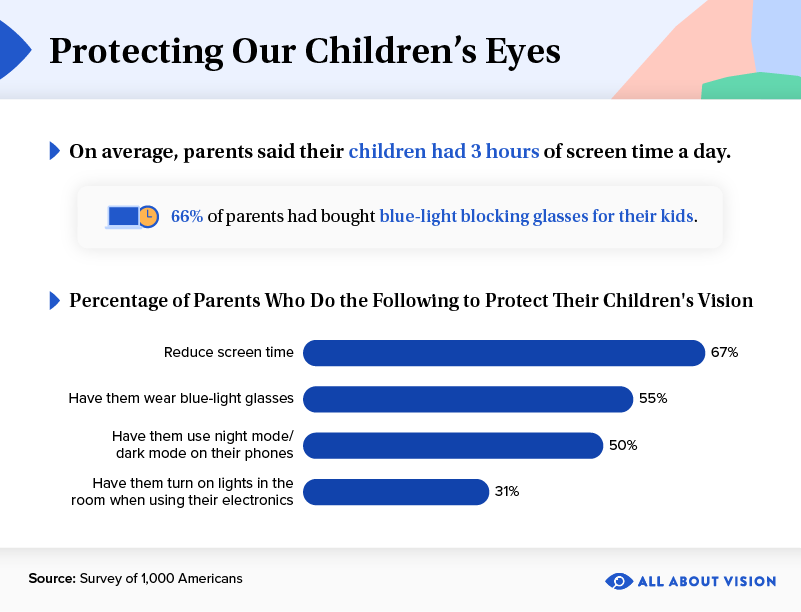 It’s worth considering computer glasses or blue light glasses for kids. Among those surveyed, 71% were parents, and they reported their children are usually on screens for an average of three hours per day. The number of hours kids spend on screens may actually be much higher than they estimated, with some teens spending up to 9 hours per day.