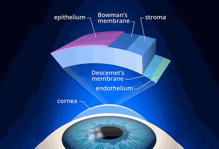 The Descemet membrane anchors the endothelium to the stroma. The endothelium is also adjacent to the fluid that circulates inside the eye (the aqueous humor). Since this fluid is under pressure, it can press the endothelium and the Descemet membrane forward through a damaged cornea, just like an inner tube can bulge through a thin spot in a tire.