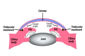Angle-closure glaucoma is when the angle is blocked. The fluid can’t drain out of the eye, so eye pressure rises. This can happen slowly (chronic) or suddenly (acute).