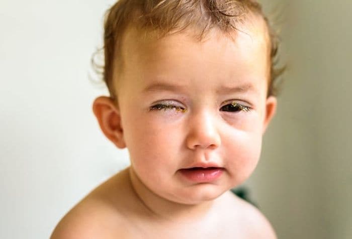 Eye discharge that appears white, yellow or green and often crusts your baby’s eyes shut while they sleep