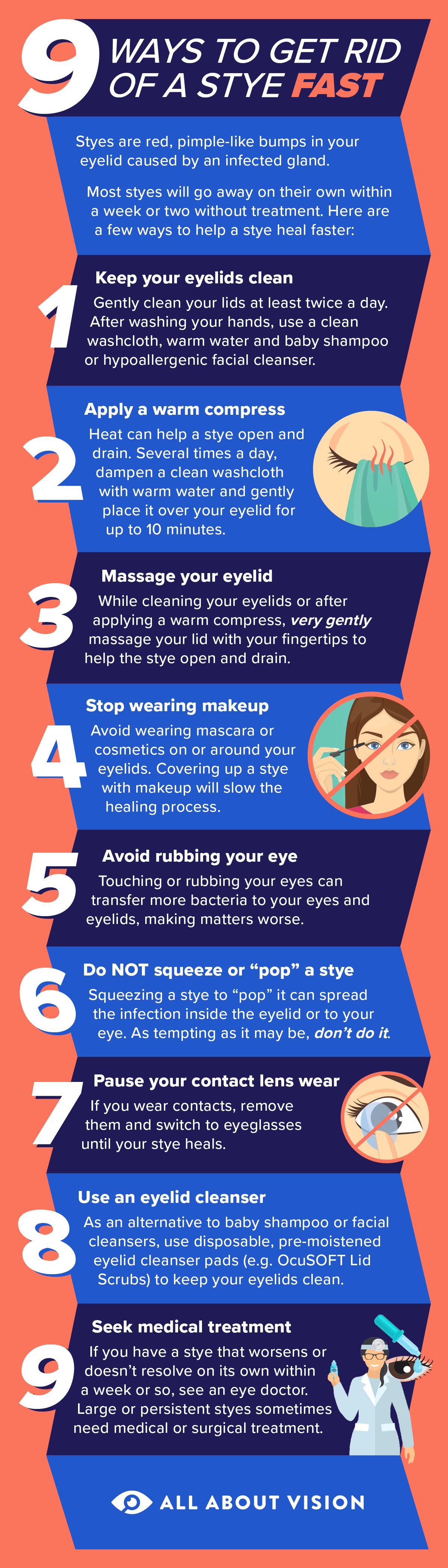 Good hygiene goes a long way toward making sure styes heal and stay gone. They are caused by bacteria becoming trapped in a clogged oil gland, so the last thing you want to do is introduce more dirt, oil and bacteria.