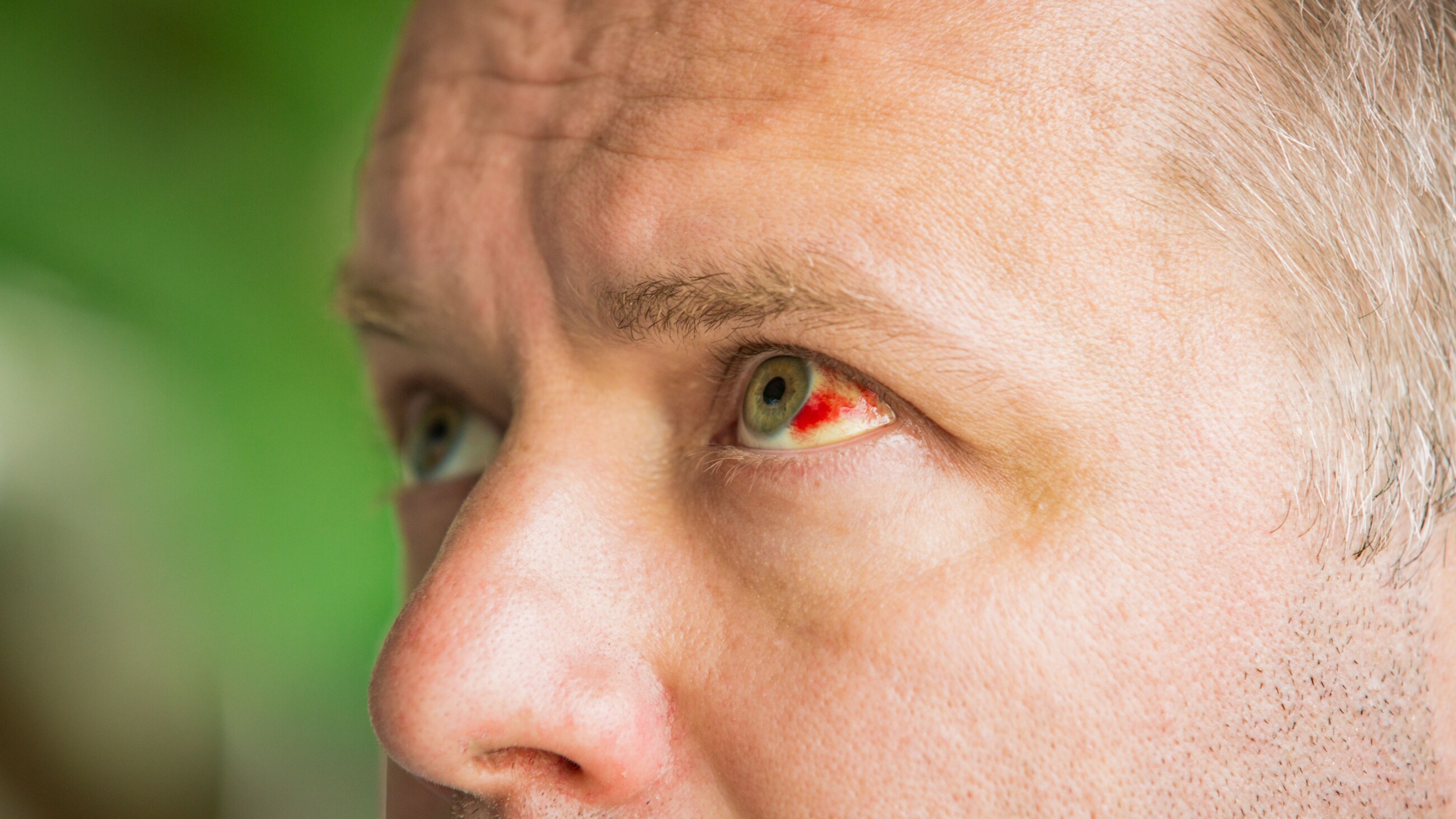 - A subconjunctival hemorrhage is a bright red splotch in the white part of the eye (the sclera). It's caused by broken blood vessels and isn't usually serious.