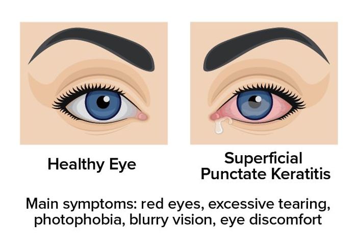 This, and other viral infections, disrupt the cornea and lead to the development of SPK. In addition to redness, symptoms include light sensitivity, irritation, tearing and watery discharge.