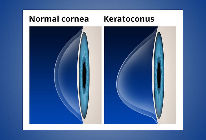 Keratoconus is a progressive eye disease in which the normally round cornea thins and begins to bulge into a cone-like shape. This cone shape deflects light as it enters the eye on its way to the light-sensitive retina, causing distorted vision.