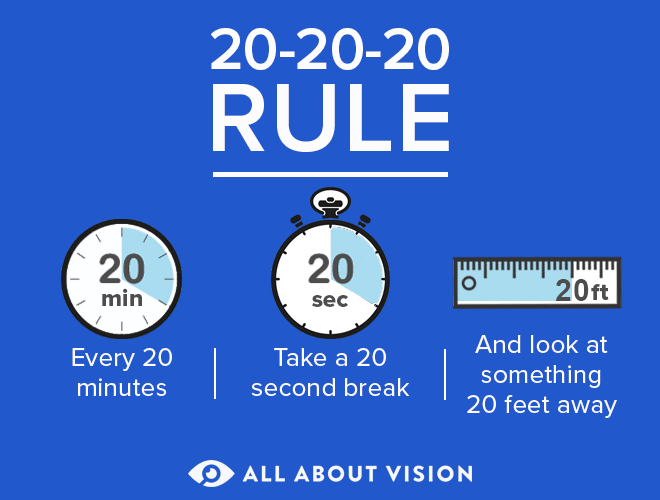 Take visual breaks – an easy way to remember this is the 20-20-20 rule (every 20 minutes, for 20 seconds, look at something at least 20 feet away).