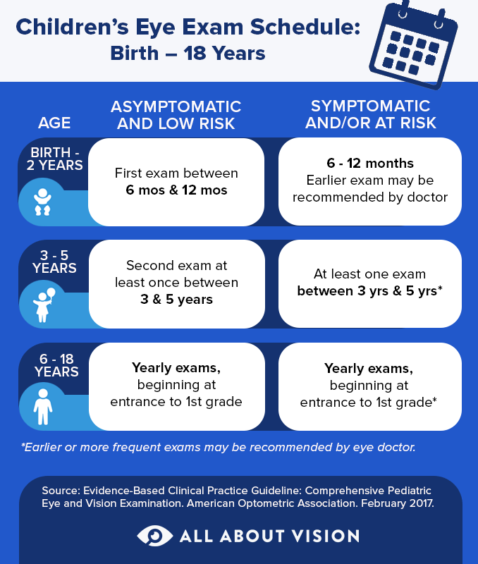 A child’s first eye exam should be done between ages 6 months and 12 months. They should receive another exam between 3 and 5 years of age, followed by yearly exams until adulthood.