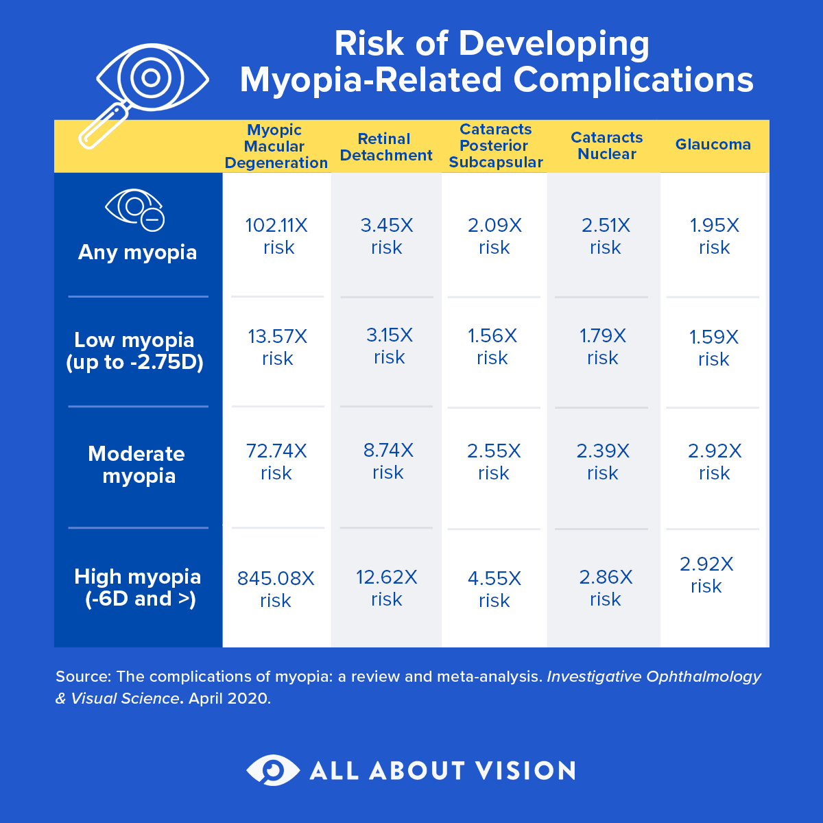 People who have progressive myopia and high myopia have a much higher risk of complications than those with low or no myopia.