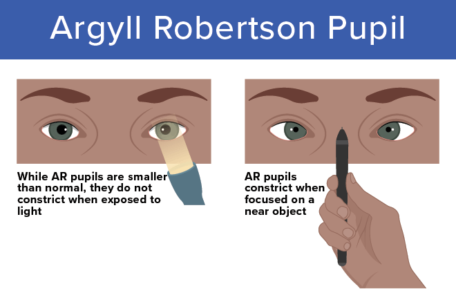 Argyll Robertson pupil is sometimes confused with tonic or Adie’s tonic pupil. Adie’s tonic pupil is also characterized by light–near dissociation. However, while AR pupils are small and misshapen, Adie’s tonic pupils remain dilated, regardless of light levels.