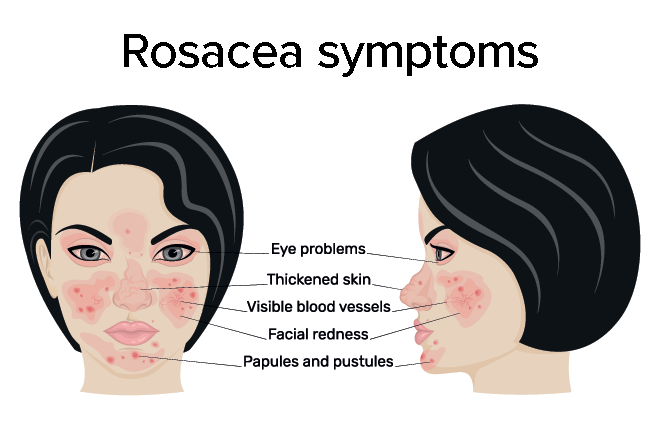 People with rosacea often have a "ruddy" complexion in the early stages, such as a reddish nose and cheeks. These symptoms often progress to include development of bumpy red skin lesions, pimples, and tiny, tortuous vessels in the skin known as telangiectasias (tel-an-jee-ek-TAY-zee-ahs).