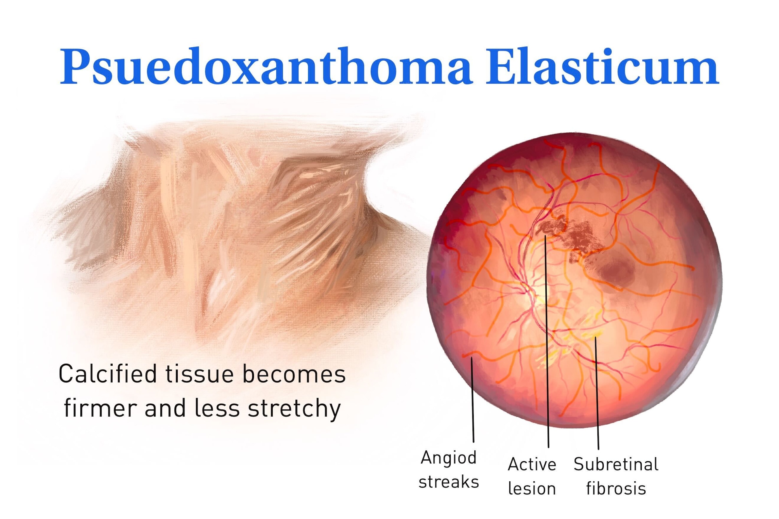 Pseudoxanthoma elasticum (PXE) is a rare genetic disease that causes calcium to build up in your body's stretchy (elastic) tissues over time. This can make the tissues stiffer and lead to problems with your skin, eyes, blood vessels and digestive system.