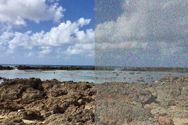Depiction of typical vision (left) vs. vision with broadband visual snow syndrome (right). [Image credit: Kara Perricone]
