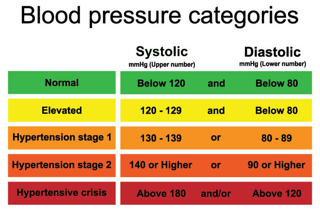 Blood pressure is considered elevated when the systolic pressure is over 120 mm Hg with a normal diastolic under 80 mm Hg. Stage 1 hypertension is when the systolic is regularly over 130 or the diastolic is regularly over 80, and it is stage 2 hypertension when the systolic is regularly over 140 or the diastolic is regularly over 90.
