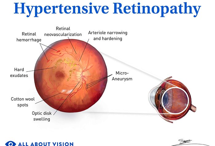 Hypertensive retinopathy is when high blood pressure (hypertension) damages the blood vessels on the inside of the eye (retina and choroid). It's generally diagnosed during an eye exam and usually does not affect vision unless it has progressed to an advanced stage.