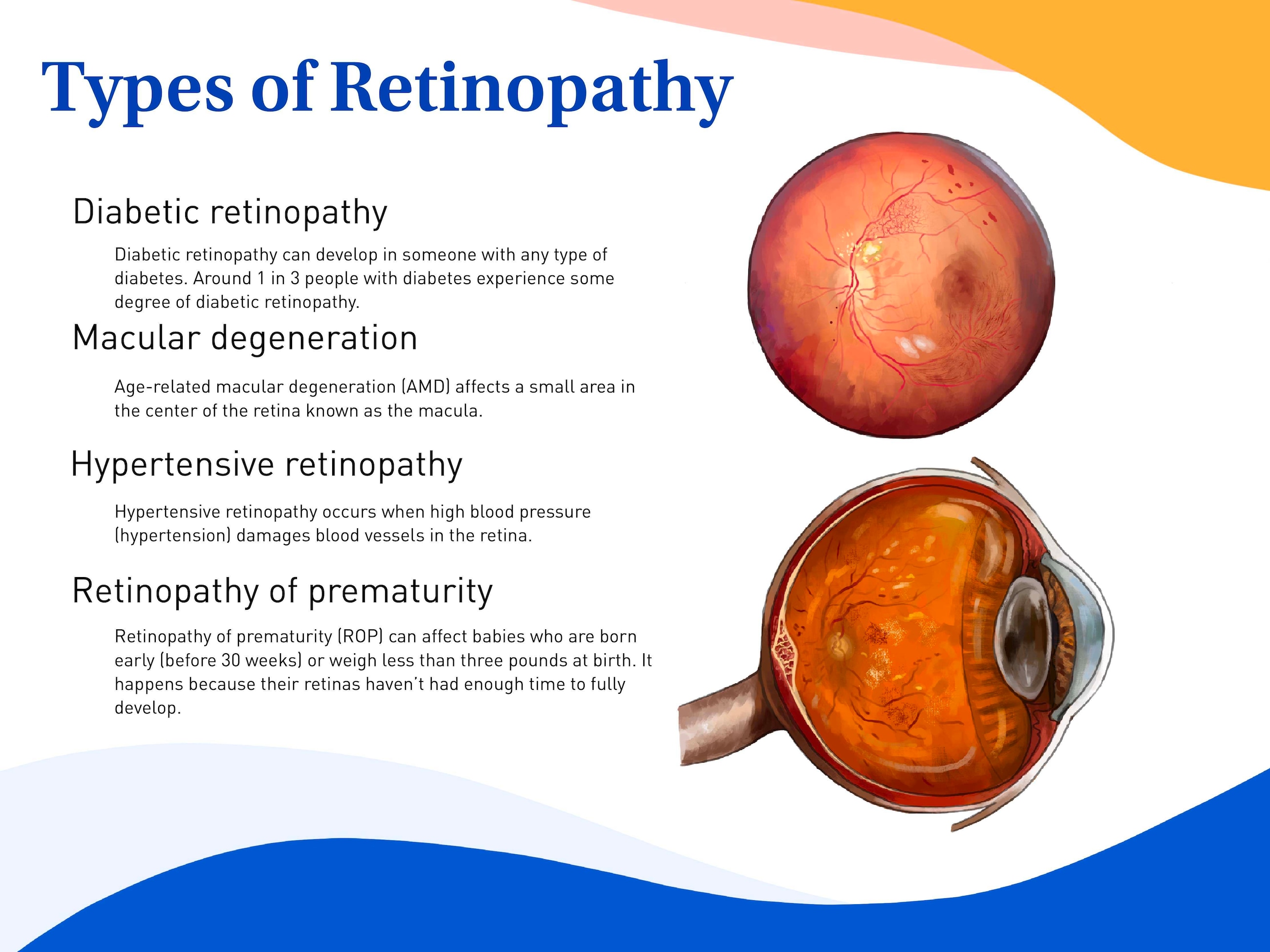 Retinopathy is a medical term that means retina damage. There are many types of retinopathy, and each one happens for a different reason. People often develop retinopathy because of a health condition like diabetes, high blood pressure or a genetic disorder.