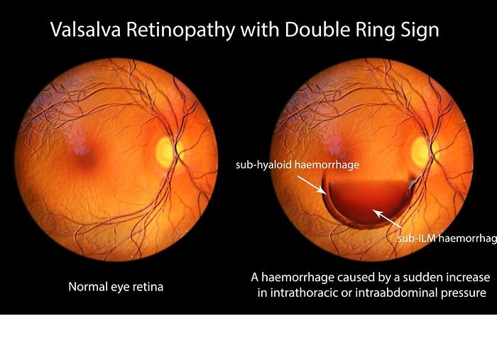Valsalva retinopathy is a type of retinopathy that is triggered by increased pressure in the chest or abdomen. This heightened pressure can cause the blood vessels in the retina to rupture and bleed (retinal hemorrhage). Valsalva retinopathy is associated with force caused by the Valsalva maneuver.