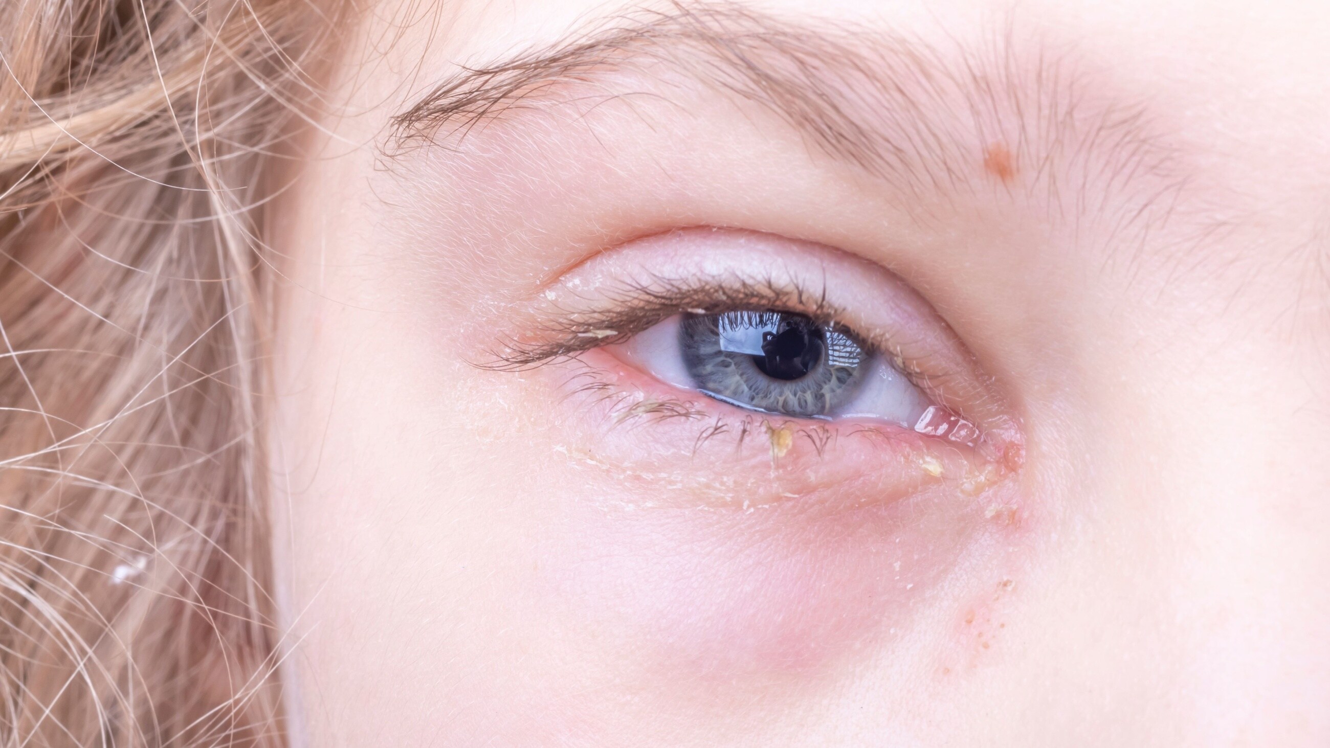 In some cases, eyelid crusting can be so severe that it temporarily seals your eye shut.