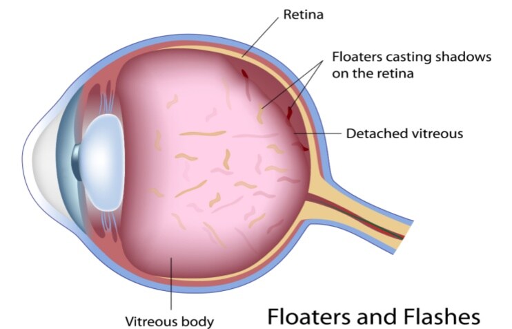 A sudden "shower" of floaters might indicate an age-related condition called posterior vitreous detachment (PVD). This occurs when the vitreous humor, a gel-like substance in the eye, separates from the retina (the light-sensitive tissue at the back of the eye) more suddenly than usual. However, sudden floaters — especially with flashes of light or vision loss — could signal a retinal tear or retinal detachment (when the retina pulls away from the back of the eye). This can cause blindness without prompt treatment.