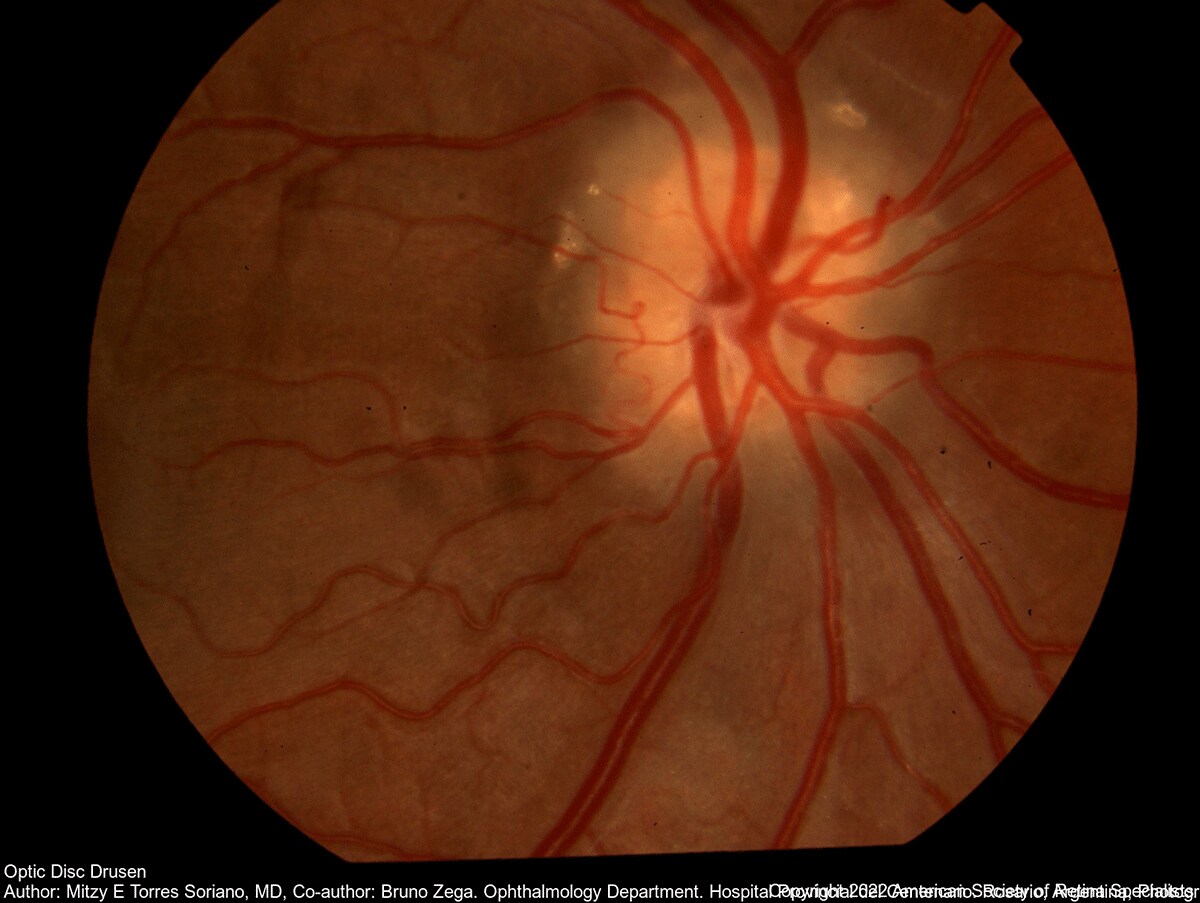 Optic nerve drusen [Image credit: This image was originally published in the Retina Image Bank® website. Author: Mitzy E Torres Soriano, MD. Photographer: Mitzy E. Torres Soriano. Retina Department. Hospital Provincial del Centenario. Rosario, Argentina. Optic disc drusen. Retina Image Bank. 2016; Image Number 26681. © the American Society of Retina Specialists.]
