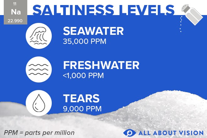 Each human tear only contains about 0.3mg worth of salt. However, the salt content of your tears varies depending on the type of tear you’re producing.