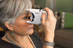 The Icare Home device is easy to use: you just position it over your eye, with the help of red and green light signals. There's no puff of air, no drops are needed, and the device automatically identifies which eye you're measuring.