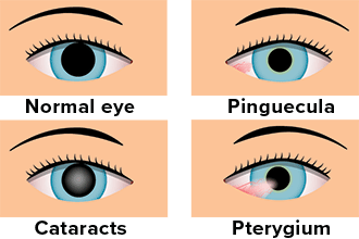 - Pinguecula and pterygium – growths on the sclera (white part of the eye)