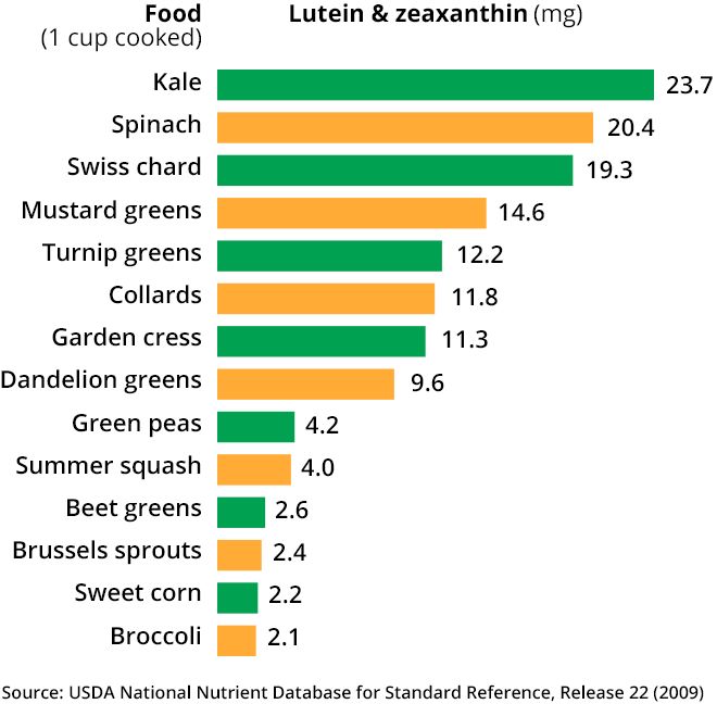 The best natural food sources of lutein and zeaxanthin are green leafy vegetables and other green or yellow vegetables. Among these, cooked kale and cooked spinach top the list, according to the U.S. Department of Agriculture (USDA).