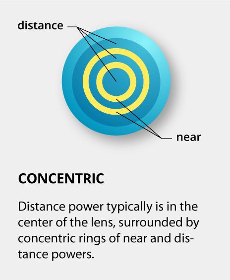 - Concentric multifocal contact lenses. These multifocal contacts have a primary viewing zone in the center of the lens, surrounded by concentric rings of near and distance powers. The central viewing zone usually is for viewing distant objects (called a center-distance design), but center-near designs also are available. In some cases, a center-distance design is used for the wearer's dominant eye and a center-near design is used for the non-dominant eye.
