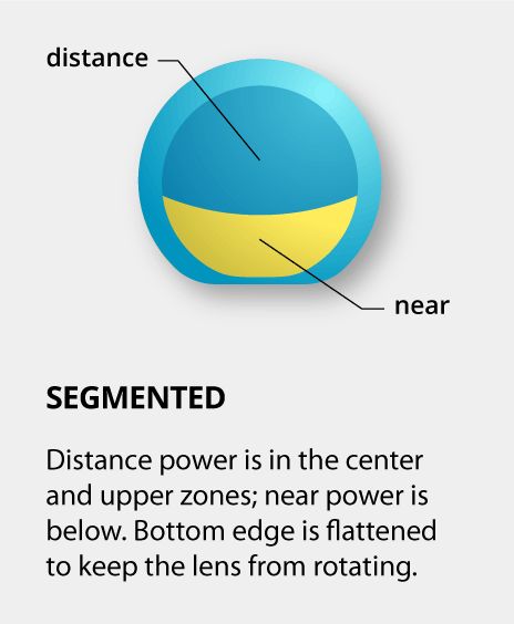 Segmented multifocal designs. Segmented multifocal contact lenses have a design that's very similar to bifocal and trifocal eyeglass lenses. These lenses have a zone for distance vision in the upper and central zones of the lens, with a zone for near vision in the lower half of the lens. The distance and near zones are separated by a visible line in the lenses.