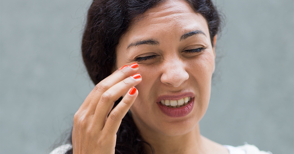 A woman with her eyes closed and hands placed on her face as she looks for a lost contact lens.