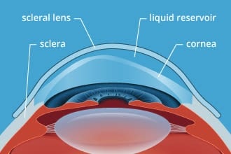 Scleral lenses rest on the white sclera of the eye and vault over the irregularly shaped cornea. In addition to providing a more stable fit, scleral lenses sometimes are more comfortable than smaller GP lenses on a keratoconic eye because they don't exert any pressure on the sensitive corneal tissue.