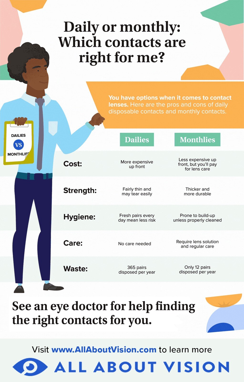 Also keep in mind that switching from monthly to daily contacts may increase lens costs, while going from dailies to monthlies will require ongoing contact lens care and maintenance.