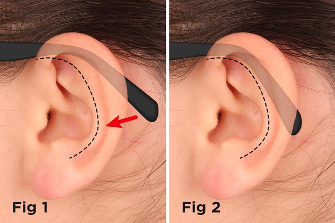 - The temples of the frame should be long enough so they can be bent downward at about a 45-degree angle at a point just beyond the top of your ears. About 30 to 45 mm of the temple should extend beyond this bend point and be adjusted to conform closely to the contour of your head behind your ear. This will keep the frame securely in place without any pressure on your ears that could cause discomfort.