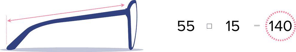 Temple length is the length of your glasses’ arm pieces. It’s the distance between the bend of the arm, all the way to where it meets the frame. While the length is probably between 120 and 150 mm, there are some common industry standards: 135, 140, 145 and 150 mm.