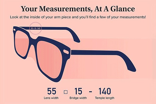 Most frame sizes are marked on the inside of one of the temple arms. Which arm it’s on varies, so you may have to check both. Measurements are in millimeters and listed in three segments: