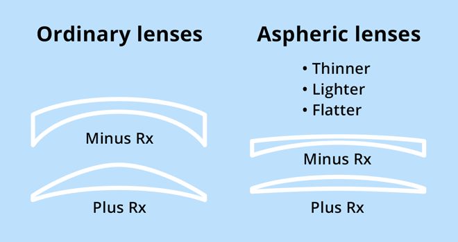 Because aspheric lenses have flatter curves than conventional lenses, they fit closer to your face. This is a major benefit for anyone wearing a strong correction.