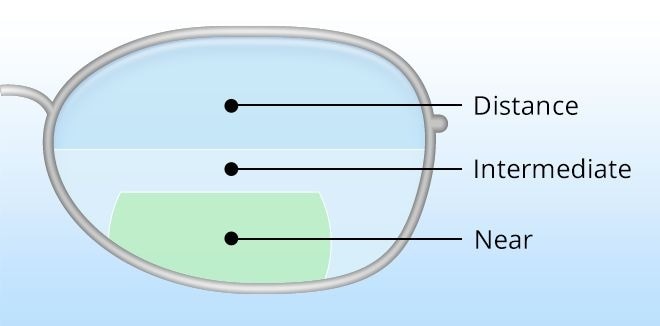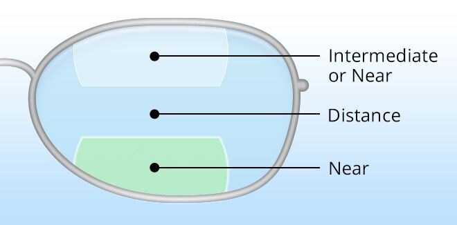 An E-D trifocal has a distance correction along the top half of the lens, separated from the intermediate correction in the bottom half by a line that goes all the way across the width of the lens (called Executive style). A D-shaped segment with near correction is in the lower half of the lens.