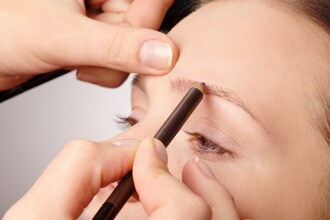 Using an eyebrow pencil, or eyebrow powder and a thin brush, lightly fill in your eyebrows using short, dash-like strokes and following the natural arch of your brow.