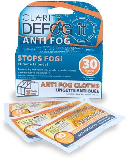 Bring an anti-fogger, such as these Defog It dry anti-fog cloths in a resealable pouch. Other options are anti-fog solutions (let them dry before you start) and fog erasers that include a sponge on one side and a soft cloth on the other side.