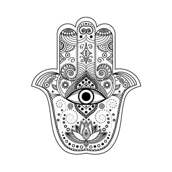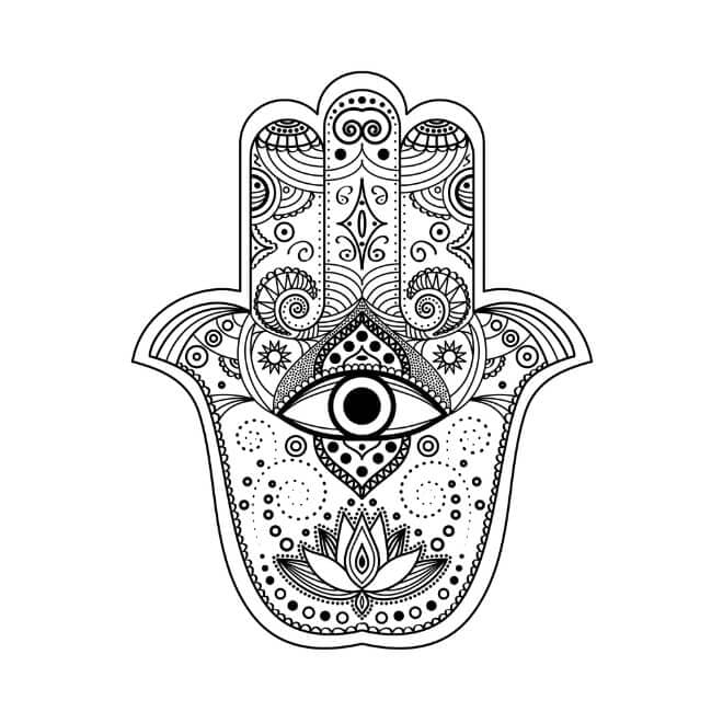 Also called the Hand of Fatima, a Hamsa is an image of a human hand with an eye in the center of the palm, often surrounded by other patterns throughout the palm and fingers. This symbol is believed to protect against the evil eye.