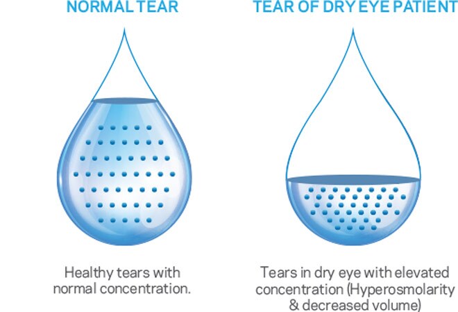 Dry eye is a condition characterized by loss of water from the tear film. As a result, the tear film becomes saltier and more concentrated. When the tear film becomes too concentrated, osmosis pulls water out of the surface of the eye, creating hyperosmolarity.