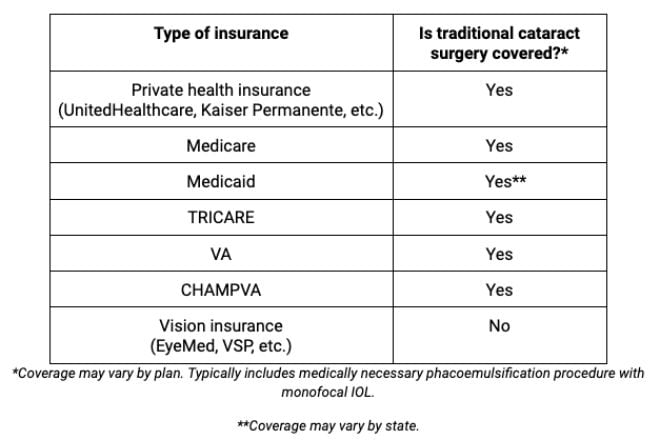 Cataract surgery is usually covered by insurance when it's "medically necessary." In most cases, this means your insurance and eye doctor agree that a cataract is causing noticeable vision problems, and surgery is the best way to treat it.