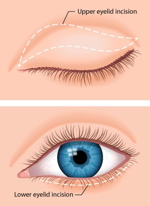 During surgery, incisions are made in the natural folds of the eyelid, in the crease of the upper eyelid and just beneath the lashes or behind the lower eyelid. This way, incisions are virtually unnoticeable after they have healed.