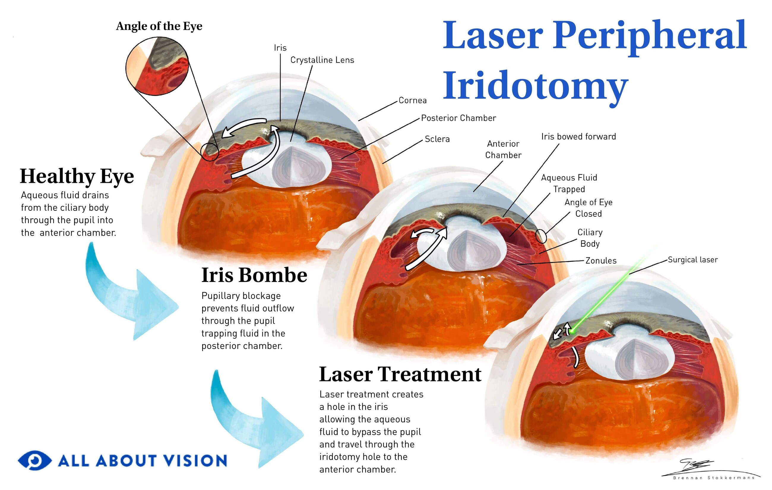 A laser iridotomy is different from an iridectomy, which is when an eye doctor surgically cuts out a piece of the iris. Both can be used to prevent an acute attack of angle-closure glaucoma.