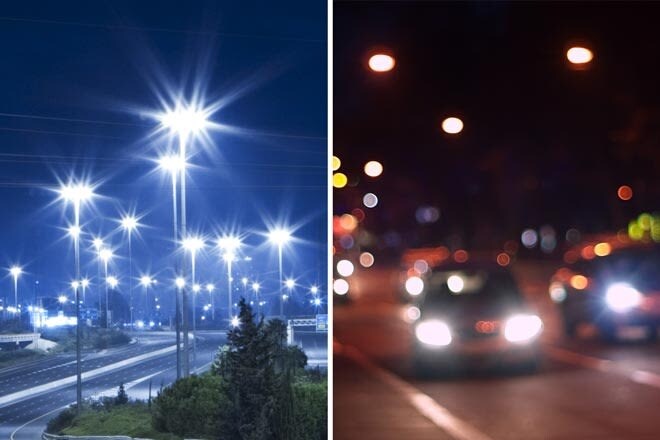 Left: What someone with post-op starbursts might see at night. Right: Nighttime halos.